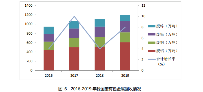 2019 年,國內廢銅、廢鋁、廢鉛和廢鋅的回收量約1199萬噸,其中廢銅回收量約 215 萬噸,廢鋁回收量約607萬噸, 廢鉛回收量約237萬噸,廢鋅回收量約140萬噸。2016-2019年我國廢有色金屬回收情況如圖6所示。
