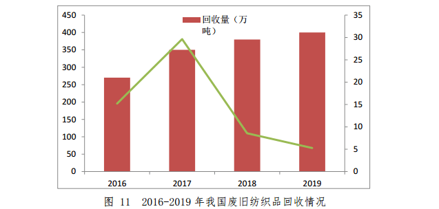2019 年,我國棉、化纖和絲三類紡織纖維加工量約6610萬噸。據估算,每年產生廢舊紡織品超過 2000 萬噸,一類是消費前工業加工領域的邊角料等,基本得到再生利用,另一類是閑散在居民手中的大量廢舊衣物和紡織品,再生利用率約 15%。2019年,我國廢舊紡織品回收量約為 400 萬噸, 同比增長 5.3%。2016-2019年我國廢舊紡織品回收情況如圖 11 所示。