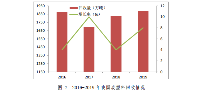 2019年國內廢塑料回收量約1890萬噸,較2018年增加了60萬噸,增幅為3.3%。2019年廢塑料進口量幾乎為零。2016-2019年我國廢塑料回收情況如圖7所示。