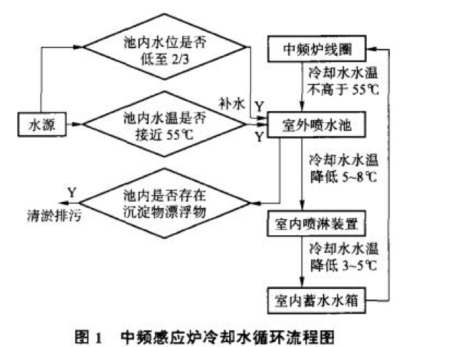 該冷卻系統以潛水泵為動力,噴水池和噴淋架為兩級冷卻裝置,以達到中頻爐冷卻水循環使用的目的。當水溫超過中頻爐冷卻要求<(55℃)及水量蒸發損失較多時,則由補水管路及時補充,同時及時排污,保持清潔。‘冷卻水池還可為噴水池周邊綠地灌溉,使水資源得到綜合利用。