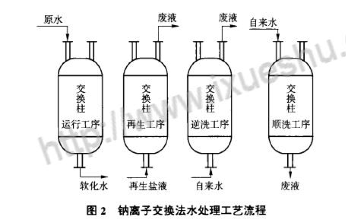 針對上述問題,采取了下列解決辦法引入去除了鈣鎂離子的軟化水來冷卻中頻爐。常用的水處理工藝是鈉離子交換法見圖,其原理是用樹脂中的鈉離子將水中容易結垢的鈣鎂離子置換出來,減少結垢,提高換熱效率。用酸洗劑加緩蝕劑清洗中頻爐線圈、管路和噴淋架,去除水垢。檢修水泵、閥門和管路,治理泄漏。