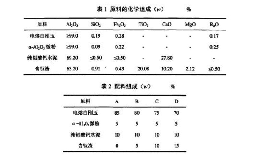 試驗用主要原料為電熔白剛玉、活性葉舢203微粉、純鋁酸鈣水泥、含二氧化鈦工業渣以及AC.H.Z200 等有機添加劑,其化學組成如表l所示。