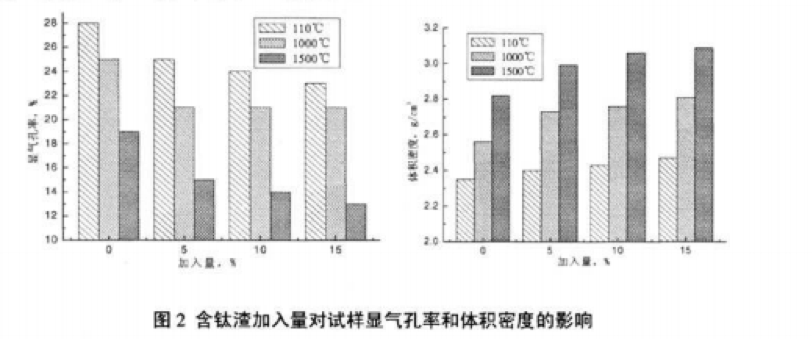 圖2所示為音鈦渣加入量對試樣顯氣孔牢、體積密度的影響。由圖可以看出.在熱處理后,試樣的 顯氣孔率和體積密度隨者含鈦渣的增加而呈現明顯的變化規律。試樣的顯氣孔率隨含鈦渣的增加而下 降,體積密度隨著含鈦渣的增加而上升。添加了古鈦渣的試樣相比空白樣而占,其顯氣孔牢有明顯的下 降,體積密度顯著增加.尤其是在1500℃的高溫處理后.舍釷渣試樣和空白樣的顯氣孔率和體積密度差 異明顯,這與上部分對試樣的線盤化率的影響分析相對應。隨著熱處理溫度的升高,試樣的顯氣孔率減 小,體積密度相應增大,明顯是含鈦渣的促燒原因。