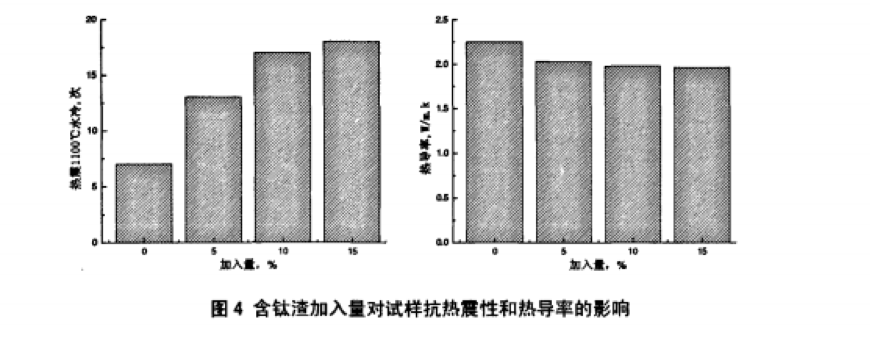圖4所示為含鈦渣添加量對試樣抗熱震性和1000℃時熱導率的影響。由圖可以看出,含鈦渣的加入 明顯提高了試樣的抗熱震性,降低了試樣的熱導率,且隨著含鈦渣加入量的增加熱震次數呈上升趨勢、 熱導率呈下降趨勢。但隨著含鈦渣加入量增加,試樣的抗熱震性和熱導率改善趨緩,這可能是由于試樣 中雖有大量鈦酸鋁形成且量逐步增大,但試樣由于燒結好而致密化導致了未現明顯改善趨勢。