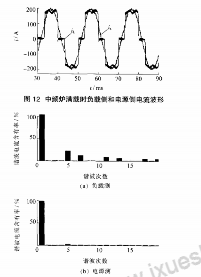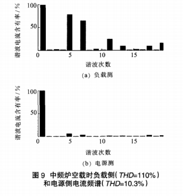 由式(1)可知.對于6脈動的中頻爐來說.它可產生大量的5次,7次,l1次,l3次,17次,19次等諧波,可歸納為6k_+l(為正整數)次諧波,各次諧波有效值與諧波次數成反比.且與基波有效值的比值為諧波次數的倒數.