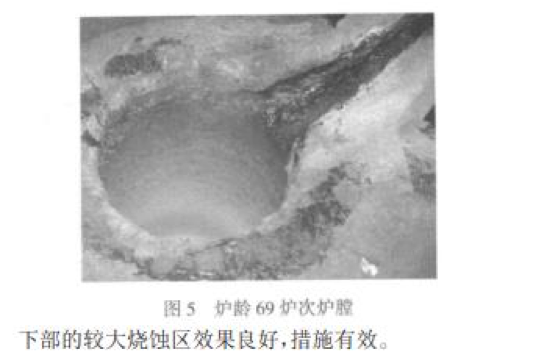 本次試驗(yàn)爐齡 79 爐次達(dá)到了預(yù)期壽命,說明試 驗(yàn)方案合理,試驗(yàn)成功。從試驗(yàn)過程中觀察到:中期 燒結(jié)有效地減緩了爐襯的損耗速度,措施有效;兩次 中修均達(dá)到了預(yù)期目的,使用短坩鍋中修應(yīng)對(duì)爐膛下部的較大燒蝕區(qū)效果良好,措施有效。
