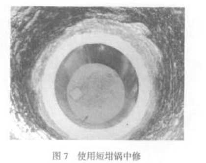 2009 年 4 月進(jìn)行了第二次試驗(yàn)。在整個(gè)中頻爐開爐過 程中,有過 5 次較長時(shí)間的停爐,中頻爐爐膛未出現(xiàn)大裂 紋。在爐齡 25 爐次時(shí),進(jìn)行第二次燒結(jié),燒結(jié)工藝是 在燒結(jié)溫度保溫 2h。在爐齡 42 爐次時(shí),在爐襯中下 部出現(xiàn)較大的燒蝕區(qū),進(jìn)行第一次中修,中修工藝是 使用短坩鍋和爐襯材料修筑爐膛底部,經(jīng)過短暫燒 結(jié)后正常開爐(圖 4)。在爐齡 69 爐次時(shí),爐膛情況正 常(圖 5),使用短坩鍋進(jìn)行第二次中修。在爐齡 79 爐 次時(shí),因中頻爐設(shè)備原因停止試驗(yàn),爐膛良好。