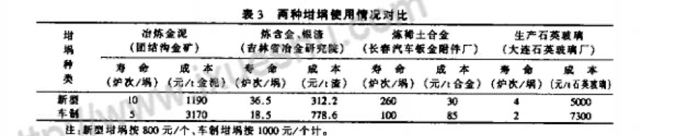 根據用戶反饋的情況,兩種中頻電爐坩堝的使用性能差別很大。新型石墨坩堝無砂眼、不滲漏;耐腐蝕性均勻,使用壽命長而穩定。電極車制坩堝常出現砂眼和滲漏,并且無規則,使用壽命長短不一.很難掌握冶煉爐次,經常造成漏爐事故。兩種中頻電爐坩堝的使用情況對比見表3。